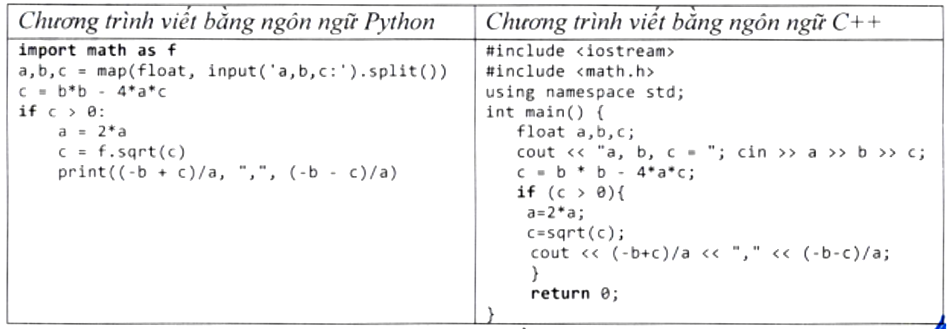 Một bạn học sinh viết chương trình giải phương trình \(a x^2+b x+c=0\) với \(\mathrm{a} \neq 0\). Hãy chọn một trong hai ngôn ngữ Python hoặc C++ sau đây để tìm hiểu chương trình này: