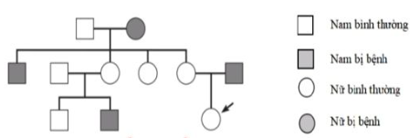 Cho rằng không phát sinh đột biến mới trong phả hệ. Tỉ lệ mắc bệnh ở nữ giới trong quần thể là 0,64%. Người phụ nữ được đánh dấu mũi tên trong hình lấy chồng không bị bệnh và đang mang thai.
