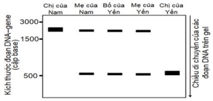 Ở người, mất điều hòa Friedreich là một bệnh di truyền gây tổn thương cho hệ thần kinh liên quan đến 1 gene FXN có 2 allele. Khi nghiên cứu về bệnh này ở gia đình người chồng (Nam) và gia đình người vợ (Yến), người ta đã thu thập các mẫu DNA mang gene FXN từ một số thành viên của gia đình, sau đó điện di trên gel agarose, kết quả thu được như hình dưới.