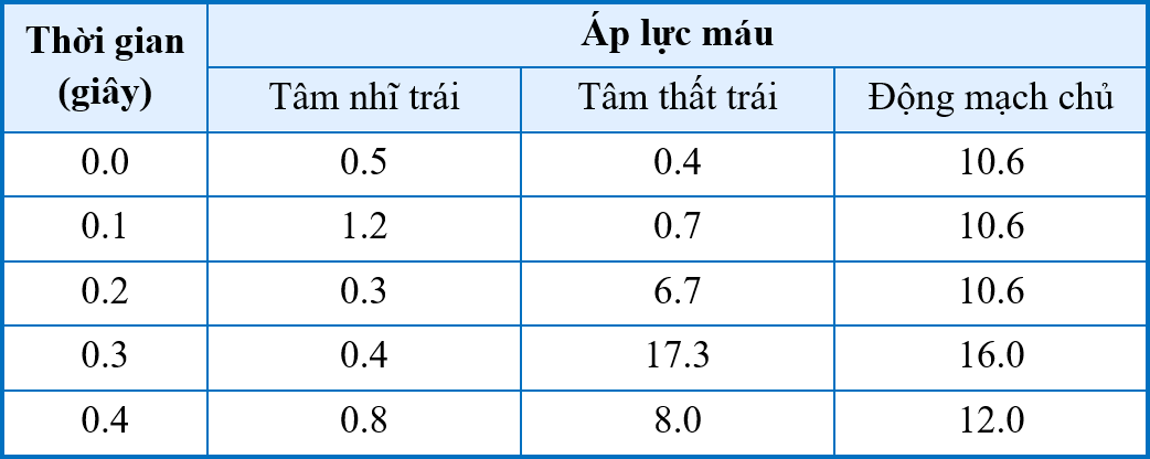 Bảng dưới đây ghi lại huyết áp trong tâm nhĩ trái, tâm thất trái và động mạch chủ tại các thời điểm khác nhau trong một phần của chu kì tim ở một loài động vật.