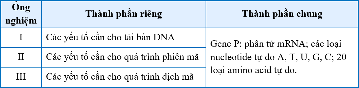 Thí nghiệm tổng hợp DNA, RNA, protein nhân tạo bằng cách bố trí ba ống nghiệm I, II, III và bổ sung thêm các thành phần như ở bảng sau: