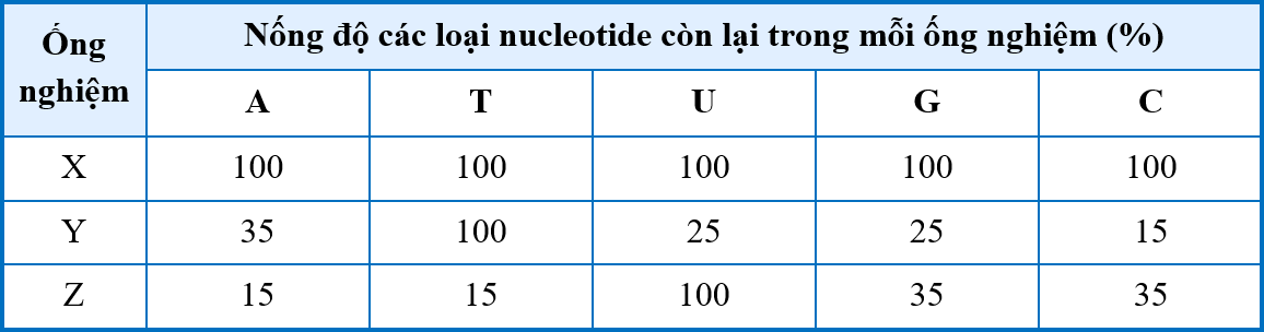 Khi tiến hành đo so ý, nhãn đánh dấu các ống nghiệm bị nhòe không còn phân biệt được các ống nghiệm I, II và III nên nhóm nghiên cứu đặt giả tạm thời lại các nhãn là X, Y, Z và xác định tỉ lệ các loại nucleotide tự do A, T, U, G, C còn lại trong mỗi ống nghiệm sau một thời gian thí nghiệm để đánh dấu lại và thu được kết quả như sau: