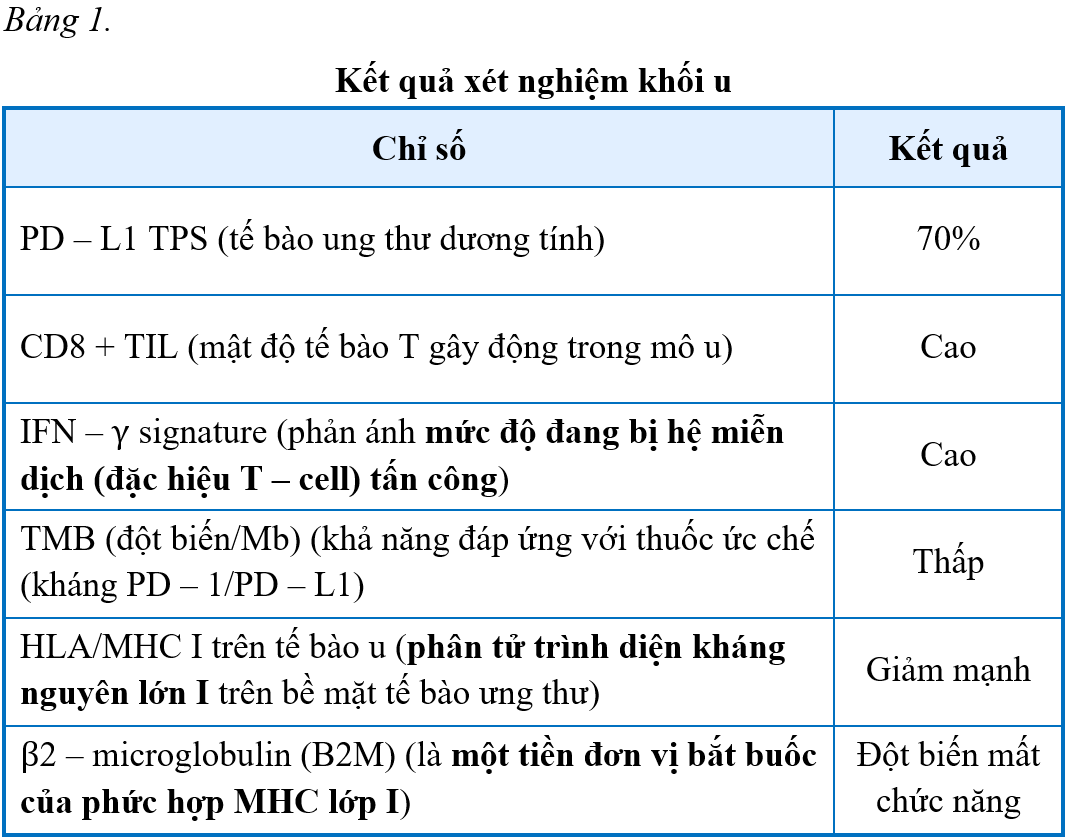 Phân tích các chỉ dấu sinh học miễn dịch khối u (PD-L1, CD8 TIL, IFN-γ, TMB, MHC I/B2M) để đánh giá cơ chế đáp ứng/kháng trị liệu kháng PD-1/PD-L1.
