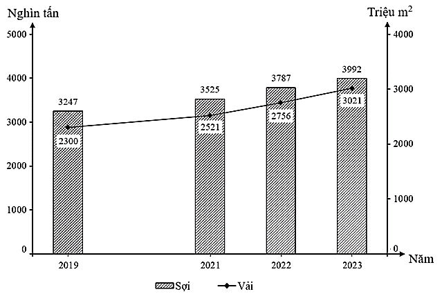 Dựa vào biểu đồ và nhận xét sự thay đổi sản lượng vải và sợi giai đoạn 2019 - 2023.