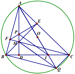 2) Cho tam giác ABC nhọn nội tiếp đường tròn \((\mathrm{O})\), các đường cao \(\mathrm{AD}, \mathrm{BE}, \mathrm{CF}\) cắt nhau tại H. Kẻ đường kính AQ của đường tròn \((\mathrm{O})\) cắt cạnh BC tại I.