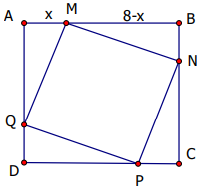 Một cái sân hình vuông ABCD có cạnh là 8 m. Người ta muốn lát gạch màu khác để trang trí lên mảnh sân hình vuông MNPQ nội tiếp trong sân hình vuông ABCD. Tìm vị trí của M, N, P, Q để hình vuông MNPQ có diện tích nhỏ nhất?