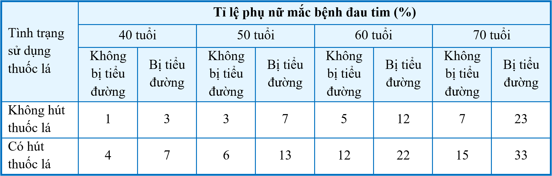 Một nghiên cứu tại New Zealand đã khảo sát tỉ lệ phụ nữ mắc bệnh đau tim ở các độ tuổi khác nhau, xét theo tình trạng sức khỏe (bị bệnh tiểu đường hoặc không bị bệnh tiểu đường) và thói quen (không hút thuốc lá hoặc có hút thuốc lá).