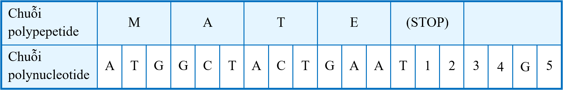 Xét hệ gene trong nhân ở một loài động vật. Bảng dưới đây minh họa một chuỗi polynucleotide của một gene mã hóa cho chuỗi polypeptide có trình tự amino acid là MATE (mỗi chữ cái là 1 loại amino acid), các nucleotide từ số 1 đến số 5 chưa xác định.
