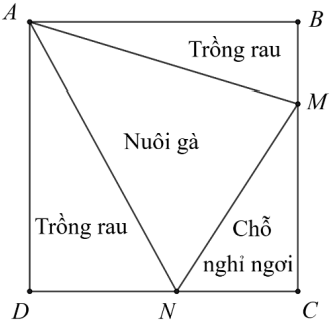 Bác Hoa có mảnh đất dạng hình vuông ABCD diện tích \(64 \mathrm{m}^2\), bác dự định chia mảnh đất này thành bốn phần như hình vẽ, trong đó phần đất dạng tam giác CMN có diện tích không thay đổi là \(2 \mathrm{m}^2\) sẽ dựng mái che để nghỉ ngơi, hai phần đất dạng tam giác ADN và ABM để trồng rau, phần còn lại để quây nuôi gà. Em hãy xác định giúp bác Hoa vị trí của các điểm M, N trên cạnh BC, CD sao cho diện tích đất để trồng rau là lớn nhất.