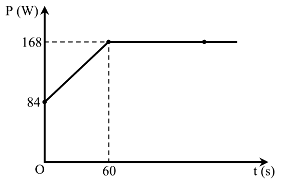 Có $100\text{~g}$ nước đá ở $- 40^{0}C$ đang được cấp nhiệt. Tại thời điểm $t = 0$, bắt đầu đóng công tắc của nguồn nhiệt, công suất của nguồn nhiệt tăng đều trong $60\text{~s}$ đầu tiên và giữ không đổi sau đó (được thể hiện bởi đồ thị hình vẽ). Quá trình cấp nhiệt kéo dài trong 5 phút. Cho biết nhiệt dung riêng của nước đá và của nước lần lượt là $2100\dfrac{\text{J}}{\text{kg}\text{.K}}$ và $4200\dfrac{\text{J}}{\text{kg}\text{.K}}$. Nhiệt nóng chảy riêng của nước đá là $336\dfrac{\text{J}}{\text{g}}$. Nhiệt độ của nước đá tiếp tục tăng cho đến thời điểm $t_{1}$ và không đổi trong khoảng thời gian $t$ với $t_{1} \leq t \leq t_{2}$. Bỏ qua trao đổi nhiệt với môi trường.