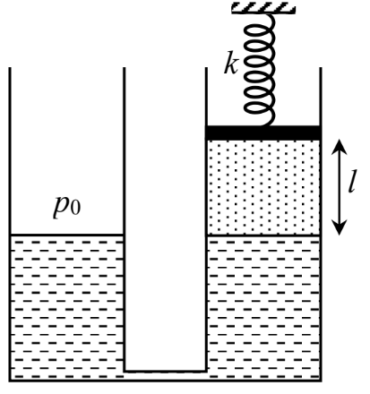 Trong hai bình thông nhau có mặt cắt ngang $S = 50\text{~cm}^{2}$, chứa nước. Trong một bình, có một piston không trọng lượng, được gắn với một lò xo cố định có độ cứng $k = 100\text{~N/m}$. Không gian dưới piston được chứa đầy không khí (coi là khí lí tưởng). Khi nhiệt độ không khí trong bình là $t_{0} = 27^{0}C$ thì khoảng cách giữa piston đến mặt nước là $l = 40\text{~cm}$, lò xo không bị biến dạng và mức nước trong cả hai bình là bằng nhau. Biết áp suất khí quyển là $p_{0} = 10^{5}\text{~Pa}$, khối lượng riêng của nước là $\rho = 1000\text{~kg/m}^{3}$, gia tốc trọng trường là $g = 10\text{~m/s}^{2}$. Bỏ qua áp suất hơi nước và ma sát khi di chuyển piston. Cho hằng số khí $R = 8,31\text{~J/(mol}\text{.K)}$.
