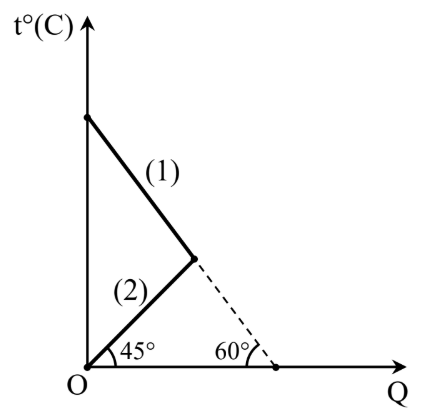 Hai vật (1) và (2) có cùng khối lượng cho tiếp xúc và trao đổi nhiệt với nhau. Hình vẽ bên dưới là đồ thị biểu diễn sự thay đổi nhiệt độ của từng vật theo nhiệt lượng mà hai vật trao đổi cho nhau.