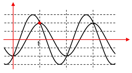 Hình vẽ bên là đồ thị biểu diễn hiệu điện thế và cường độ dòng điện tức thời chạy qua mạch theo thời gian (các đường hình sin). Độ lệch pha giữa hiệu điện thế và cường độ dòng điện trong mạch bằng bao nhiêu độ? (kết quả làm tròn đến chữ số hàng phần mười).