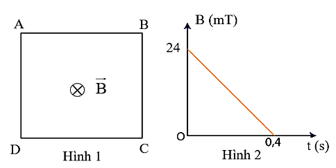 Một khung dây dẫn phẳng ABCD có diện tích 20 cm², gồm 20 vòng dây đặt trong từ trường đều có các đường sức từ vuông góc với mặt phẳng khung như hình 1. Biết vectơ cảm ứng từ $\overset{\rightarrow}{B}$ có chiều hướng từ ngoài vào trong mặt phẳng hình vẽ và có độ lớn phụ thuộc vào thời gian t theo đồ thị hình 2.