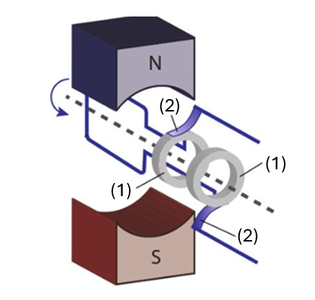 Hình bên là sơ đồ cấu tạo của một máy phát điện xoay chiều một pha: Khung dây dẫn phẳng có diện tích 80 cm2, gồm 100 vòng dây, quay đều với tốc độ 90 vòng/phút quanh trục cố định vuông góc với đường sức từ của từ trường đều có cảm ứng từ B = 0,20 T.