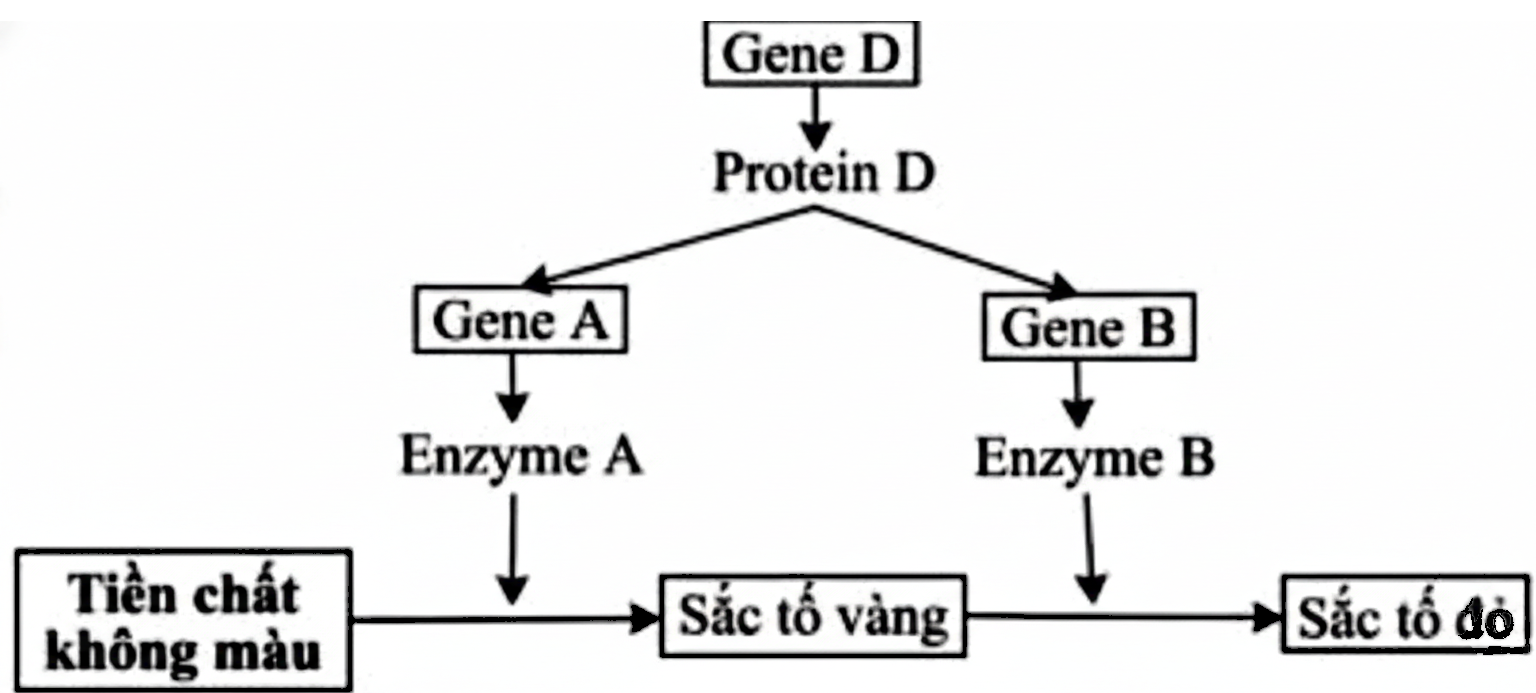 Ở một loài thực vật, sự hình thành màu hoa chịu sự chi phối của 3 locus A, B và D. Gene D tổng hợp ra protein D, khi có protein này thì các gene A và B mới có thể tạo ra enzyme có hoạt tính. Các enzyme A và B sẽ tham gia vào con đường tổng hợp sắc tố cánh hoa như sơ đồ sau: