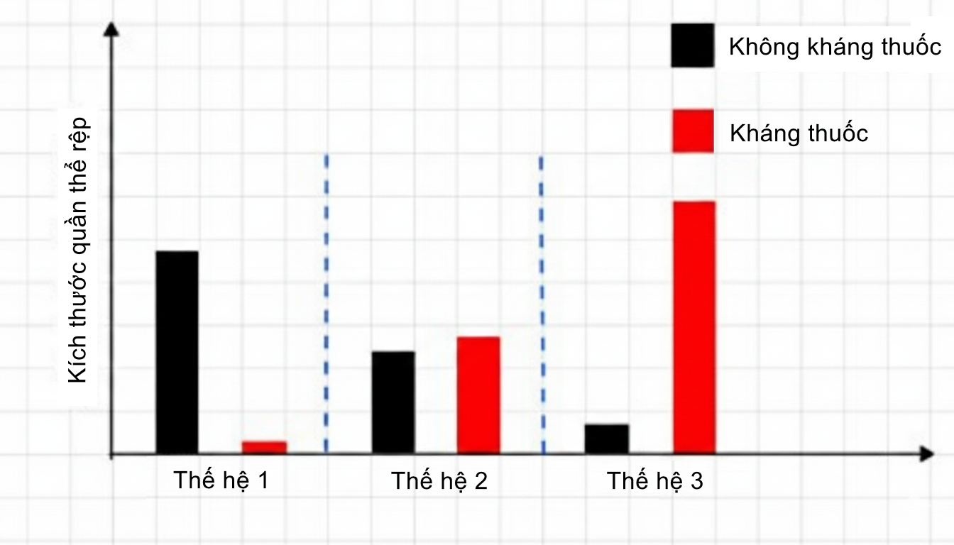Một nông dân trồng khoai tây sử dụng thuốc trừ sâu nhiều lần để phòng rệp trong khoảng thời gian hai năm. Biểu đồ ở hình sau thể hiện các mẫu của ba thế hệ kháng thuốc trừ sâu và không kháng thuốc trừ sâu trong khoảng thời gian này.