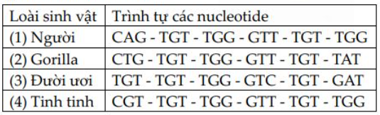 Để xác định quan hệ họ hàng giữa loài người và một số loài linh trưởng, các nhà khoa học đã phân tích một đoạn trình tự nucleotide trên mạch khuôn của một gene mã hóa cấu trúc nhóm enzyme dehydrogenase như trong bảng sau. Xác định thứ tự các loài (gồm 4 số) thể hiện sự giảm dần mức độ gần gũi về nguồn gốc giữa người với một số loài thuộc Bộ Linh trưởng?