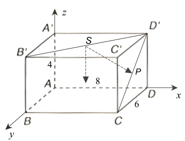 Một phòng trưng bày nghệ thuật dạng hình hộp chữ nhật $ABCD.A'B'C'D'$ với kích thước: $AD = 8$ mét, $AB = 6$ mét, $AA' = 4$ mét. Kỹ sư thiết lập hệ trục tọa độ $Oxyz$ để số hóa căn phòng như sau: Gốc tọa độ $O\left( {0;0;0} \right)$ đặt tại $A$; các trục $Ox$, $Oy$, $Oz$ lần lượt trùng với các cạnh $AD$, $AB$, $AA'$ (chiều dương lần lượt từ $A$ đến $D$, từ $A$ đến $B$, từ $A$ đến $A'$, đơn vị trên các trục tọa độ là mét). Hệ thống giám sát có một camera gắn tại tâm $S$ của mặt trần $A'B'C'D'$ và một cảm biến hồng ngoại gắn tại đỉnh $C$. Camera đang giám sát một bức tranh được treo chính giữa bức tường $CDD'C',$ gọi $P$ là tâm của bức tranh (cũng là tâm của hình chữ nhật $CDD'C').$