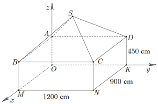 Một ngôi nhà gồm hai phần, phần thân nhà dạng hình hộp chữ nhật $ABCD.OMNK$có chiều dài $1200\text{cm}$, chiều rộng $900\text{cm}$, chiều cao $450\text{cm}$. Phần mái nhà $S.ABCD$có dạng một hình chóp tứ giác có các cạnh bên bằng nhau. Biết $ABCD$ là hình chữ nhật và chiều cao của ngôi nhà (khoảng cách từ $S$ đến $\left( {OMNK} \right)$) bằng 600 cm. Chọn hệ trục toạ độ $Oxyz$ sao cho $M$ thuộc tia $Ox$, $K$ thuộc tia $Oy$, $A$ thuộc tia $Oz$ (như hình vẽ), mỗi đơn vị trên hệ trục ứng với 1m. Một bóng đèn rọi đặt ở $S$ và chiếu thẳng theo hướng $SC$ thì khi đó điểm chiếu xuống mặt đất có tọa độ là $H\left( {a;b;c} \right)$.