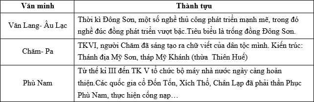 Cho bản dữ kiện về một số thành tựu của các nền văn minh Văn Lang -Âu Lạc, Chăm - Pa và Phù