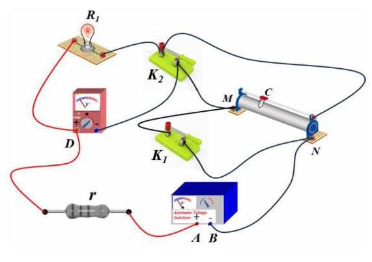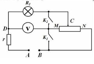 Một học sinh mắc mạch điện như hình vẽ bên gồm: nguồn điện có hiệu điện thế giữa hai đầu $A,B$ không đổi và bằng 24 V; $r = 8\Omega$; biến trở con chạy có điện trở toàn phần $R_{MN} = 18\Omega$; bóng đèn dây tóc có ghi 12 V – 12 W (điện trở $R_{1}$); vôn kế một chiều. Đặt điện trở phần MC của biến trở là $R_{MC} = x$. Cho rằng điện trở dây dẫn, các khóa $K$ là không đáng kể; vôn kế có điện trở vô cùng lớn và điện trở bóng đèn luôn không đổi.