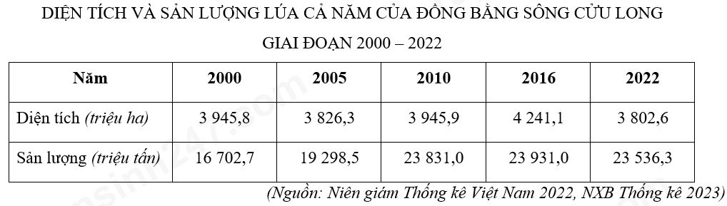 Dựa vào bảng số liệu, hãy chọn nhận xét đúng về tình hình sản xuất lúa của Đồng bằng sông Cửu Long giai đoạn 2000 – 2022?