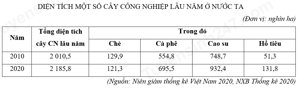 Dựa vào bảng số liệu, hãy cho biết năm 2020, loại cây nào chiếm tỉ trọng cao nhất trong tổng diện tích công nghiệp lâu năm ở nước ta?