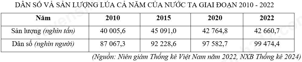 Dựa vào bảng số liệu, hãy cho biết bình quân sản lượng lúa theo đầu người của nước ta năm 2022 so với năm 2010 giảm bao nhiêu kg/người? (làm tròn kết quả đến một chữ số thập phân).