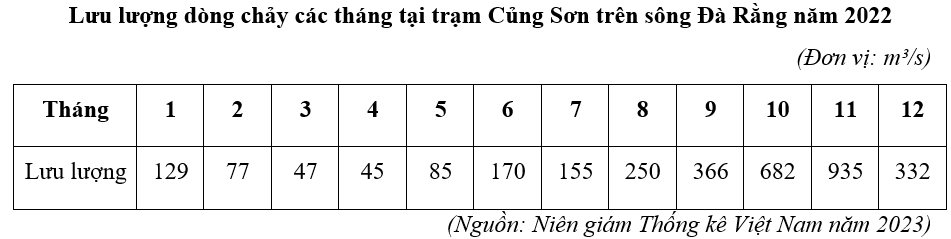 Căn cứ vào bảng số liệu trên, hãy cho biết vào năm 2022, tổng lưu lượng nước các tháng mùa lũ của sông Đà Rằng tại trạm Củng Sơn cao hơn tổng lưu lượng nước của các tháng mùa cạn bao nhiêu m³/s? (làm tròn kết quả đến hàng đơn vị).