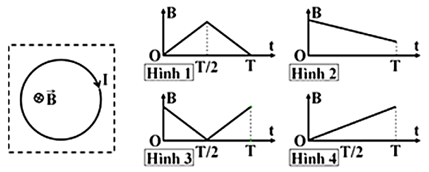 Một vòng dây dẫn hình tròn được đặt trong từ trường đều có đường sức từ vuông góc với mặt phẳng khung dây (mặt phẳng hình vẽ) hướng từ ngoài vào trong, có độ lớn cảm ứng từ $B$ phụ thuộc thời gian. Trong khoảng thời gian từ $0(s)$ đến $T(s)$, dòng điện cảm ứng $I$ có chiều không đổi theo thời gian và đã được chỉ ra như trên hình vẽ. Đồ thị diễn tả sự biến đổi của cảm ứng từ B theo thời gian có thể là hình: