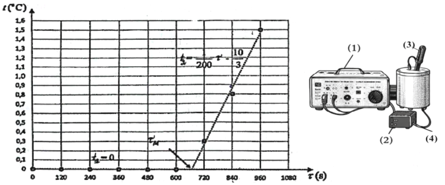 Một nhóm học sinh sử dụng bộ thí nghiệm có sơ đồ như hình dưới để đo nhiệt nóng chảy riêng $\lambda$ của nước đá. Cho nước đá có khối lượng $m = 28\text{~g}$ và một ít nước lạnh vào bình nhiệt lượng kế (4), sao cho toàn bộ điện trở chìm hoàn toàn trong hỗn hợp nước và nước đá. Dùng nhiệt kế (3) có thang đo từ $- 10^{0}C$ đến $110^{0}C$ để đo nhiệt độ của hỗn hợp nước và nước đá trong bình. Công suất trung bình tính được từ các số chỉ trên oát kế (2) là $14,24\text{~W}$. Bật nguồn điện (1). Khuấy liên tục nước đá, cứ sau mỗi 2 phút, đọc nhiệt độ trên nhiệt kế, họ vẽ được đồ thị sự phụ thuộc của nhiệt độ $t(^{{^\circ}}\text{C})$ vào thời gian đun $\tau(s)$ như sau: