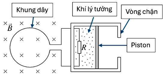 Khung dây gồm 200 vòng, có điện trở $r = 1\Omega$, phần diện tích khung dây được đặt trong từ trường vuông góc với mặt phẳng trang giấy và hướng vào trong (như hình vẽ dưới) là $0,3\text{~m}^{2}$. Độ lớn cảm ứng thay đổi theo thời gian theo biểu thức: $B = 0,05t$ (B tính theo T; t tính theo s). Khung dây mắc với điện trở $R = 5\Omega$ nằm trong bình cách nhiệt nằm ngang có thể tích bình là 1,0 lít (ở miệng bình có vòng chặn). Piston nhẹ bịt kín một khối khí lí tưởng trong bình và có thể chuyển động không ma sát với thành bình. Lúc đầu t = 0 piston đứng yên ở vị trí chính giữa của bình, áp suất khí quyển là $10^{5}\text{~Pa}$ và nhiệt độ khí là $250\text{~K}$. Kể từ $t = 0$, khí được làm nóng từ từ và piston chuyển động chậm. Tại $t = \tau$, piston dừng lại khi vừa chạm vào vòng chặn, nội năng của khí trong bình tăng thêm $100\text{~J}$ và nhiệt độ khí trong bình là T. Coi toàn bộ nhiệt lượng do R tỏa ra được khí hấp thụ.
