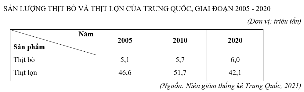 a) Dựa vào bảng số liệu và nhận xét về sự thay đổi sản lượng thịt bò và thịt lợn của Trung Quốc trong giai đoạn 2005 - 2020.