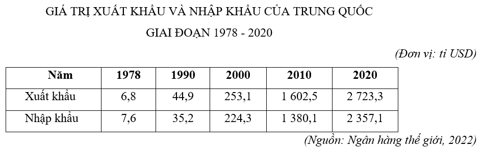 a, b) Dựa vào bảng số liệu và nhận xét về sự thay đổi giá trị xuất khẩu, nhập khẩu của Trung Quốc giai đoạn 1978 - 2020.