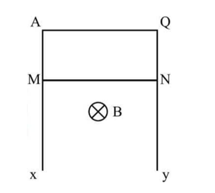 Hai thanh dẫn không điện trở Ax và Qy, đặt song song, thẳng đứng trong không gian có từ trường đều. Vectơ cảm ứng từ nằm ngang và vuông góc với mặt phẳng chứa hai thanh dẫn (hình bên), độ lớn $0,50T$. Nối hai đầu A, Q bên trên của hai thanh dẫn bằng một sợi dây không điện trở. Thanh kim loại NM có khối lượng $0,10kg$ dài $0,40m$, điện trở $R = 0,25\Omega$ được thả rơi không vận tốc đầu, trong quá trình rơi luôn tiếp xúc với 2 thanh dẫn Ax và Qy, chuyển động theo phương song song với hai thanh. Chiều dài các thanh dẫn Ax và Qy đủ dài, bỏ qua ma sát và lực cản, lấy $g = 10m/s^{2}$. Tốc độ của thanh kim loại MN đạt được bằng bao nhiêu m/s?