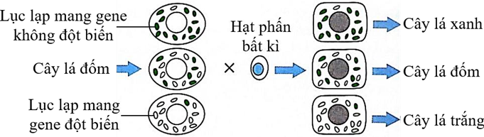 Hình dưới đây là sơ đồ mô tả sự di truyền gene ngoài nhân trong thí nghiệm của Correns trên cây hoa phấn (hoa bốn giờ). Tế bào trứng Lục lạp mang gene không đột biến Cây lá đốm Lục lạp mang gene đột biến Hạt phấn bất kì Hợp tử Cây lá xanh Cây lá đốm Cây lá trắng