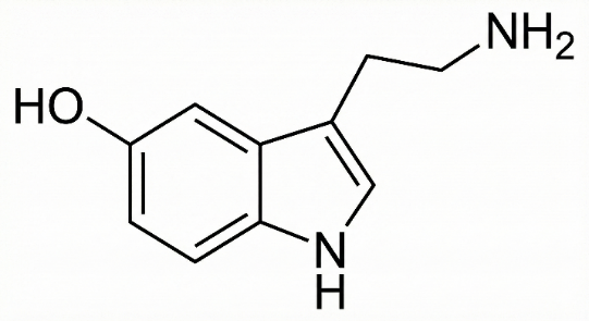 Serotonine là một chất dẫn truyền thần kinh quan trọng trong hệ thần kinh, đóng vai trò trong việc điều chỉnh tâm trạng, giấc ngủ, và chức năng tiêu hóa. Nó tác động lên các thụ thể serotonine trên bề mặt các tế bào thần kinh để gây ra các hiệu ứng sinh học như cải thiện tâm trạng và điều hòa chức năng tiêu hóa. Sự mất cân bằng trong hàm lượng serotonine liên quan đến các rối loạn như trầm cảm và lo âu. Công thức cấu tạo của serotonin như hình bên.