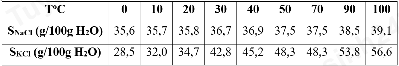Ở 100oC: 1000 (g) H2O ⟹ Khối lượng NaCl, KCl tan tối đa