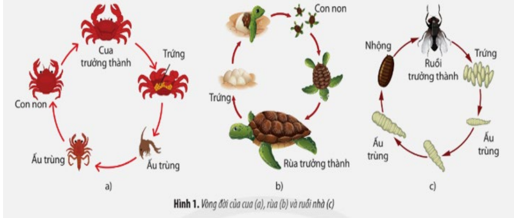b) Hãy cho biết các loài động vật trong Hình 1 có kiểu phát triển gì? Dựa vào đâu để nhận biết kiểu phát triển đó?