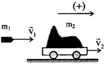 - Gọi ${\overset{\rightarrow}{v}}_{1},{\overset{\rightarrow}{p}}_{1}$ và ${\overset{\rightarrow}{v}}_{2},{\overset{\rightarrow}{p}}_{2}$ lần lượt là vận tốc của đạn và toa xe cát trước va chạm; $\overset{\rightarrow}{v},\overset{\rightarrow}{p}$ là vận tốc và động lượng của hệ (đạn + xe).