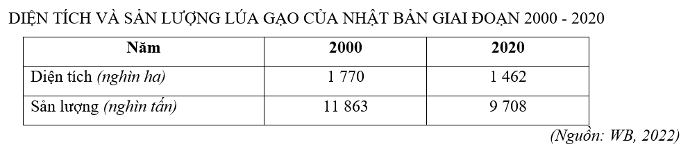 Cho bảng số liệu:Căn cứ vào bảng số liệu trên, tính năng suất lúa của Nhật Bản năm 2020?