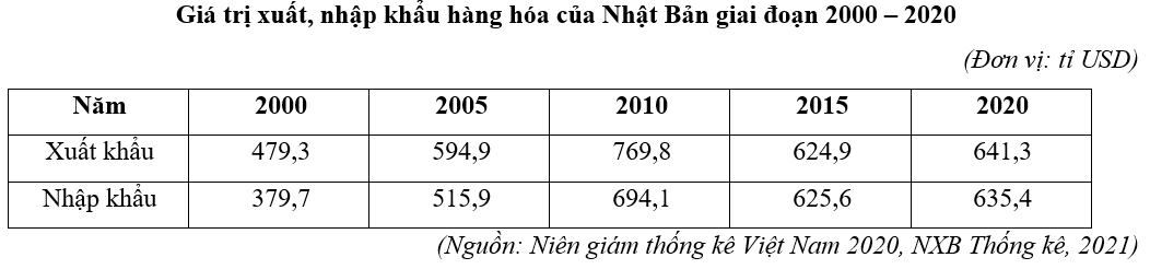 Cho bảng số liệu: Theo bảng số liệu, giá trị xuất siêu của Nhật Bản năm 2020 là bao