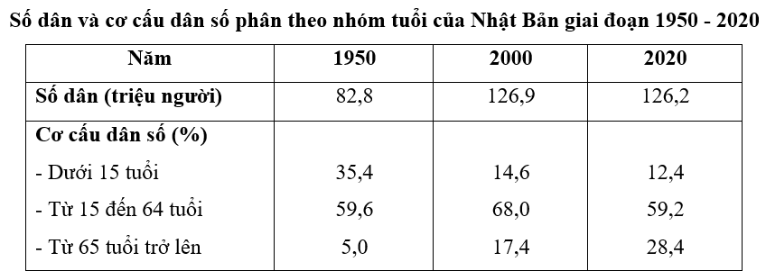 Cho bảng số liệu: Theo bảng số liệu trên, nhóm tuổi lao động (từ 15 đến 64 tuổi) của Nhật