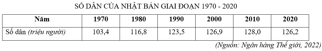 Cho bảng số liệu:Căn cứ vào bảng số liệu trên, hãy cho biết số dân của Nhật Bản năm 2020