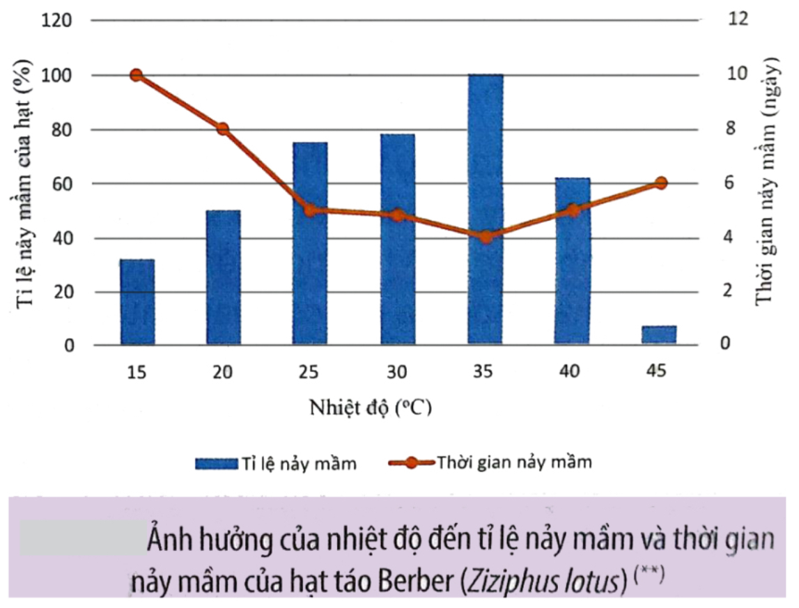 Dựa trên biểu đồ (ảnh hưởng của nhiệt độ đến sự nảy mầm của hạt táo. Nhiệt độ thích hợp nhất cho hạt nảy mầm là bao nhiêu?