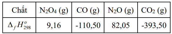 Tính biến thiên enthalpy của phản ứng: ${{N}_{2}}{{O}_{4}}(g)+3CO(g)\xrightarrow{{}}{{N}_{2}}O(g)+3C{{O}_{2}}(g)$