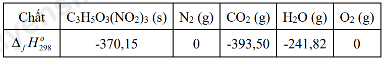 Tính biến thiên enthalpy chuẩn cho phản ứng trên và giải thích vì sao trinitroglycerin được ứng dụng làm thành phần thuốc súng không khói. Giá trị enthalpy chuẩn tạo thành của một số chất được cho trong bảng sau: