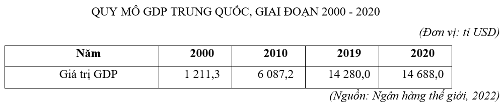 Cho bảng số liệu:Căn cứ vào bảng số liệu, hãy cho biết giá trị GDP của Trung Quốc năm 2020