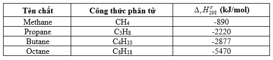 Bảng sau đây thống kê biến thiên enthalpy chuẩn ($\Delta_{r}H_{298}^{o}$) của phản ứng đốt cháy hoàn toàn 1 mol một số hydrocarbon phổ biến ở điều kiện chuẩn: